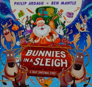 Happily though, who should be heading to the rescue on a sleigh pulled by dogs but those bunnies. Just as Santa’s reindeer are preparing to depart on the delivery round, they appear with a leap and a bound right into Santa’s sleigh. Full of the Christmas spirit they surely are.