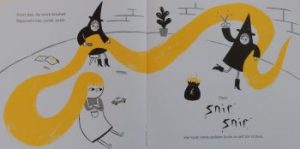 An inveterate collector of things offers would-be collectors ie readers, a tour of collections. First comes the instruction to turn on the light which serves to illuminate the narrator’s cleverly curated collection of ‘small things’. These include an ant, a paperclip, a button and an acorn. To most of these items, Bethan Woollvin has given eyes. The same is true of those in the other collections be they big (you’ll need to pause and assist in a spot of reorganisation to prevent them spilling right off the page), pointy, or prickly (the difference is known only by expert collectors), the most exciting (rocks). After which there come stinky items,