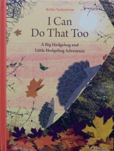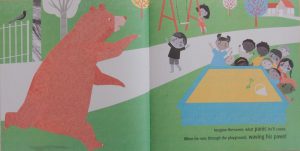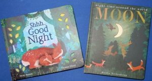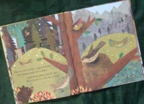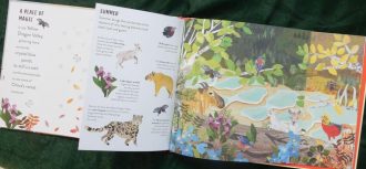The whole exhilarating story is told with wonderfully dynamic watercolour illustrations and a sequence of glorious onomatopaeaic sounds. Scrunch scrinch scrunch scrinch scrunch scrinch is just the perfect sound for bear’s footsteps in the snow. But my favourite of all accompanies moose crouching dog style on the sledge with rabbit between his hooves and bear – open mouthed – spread eagled atop moose’s antlers as the sledge bounces