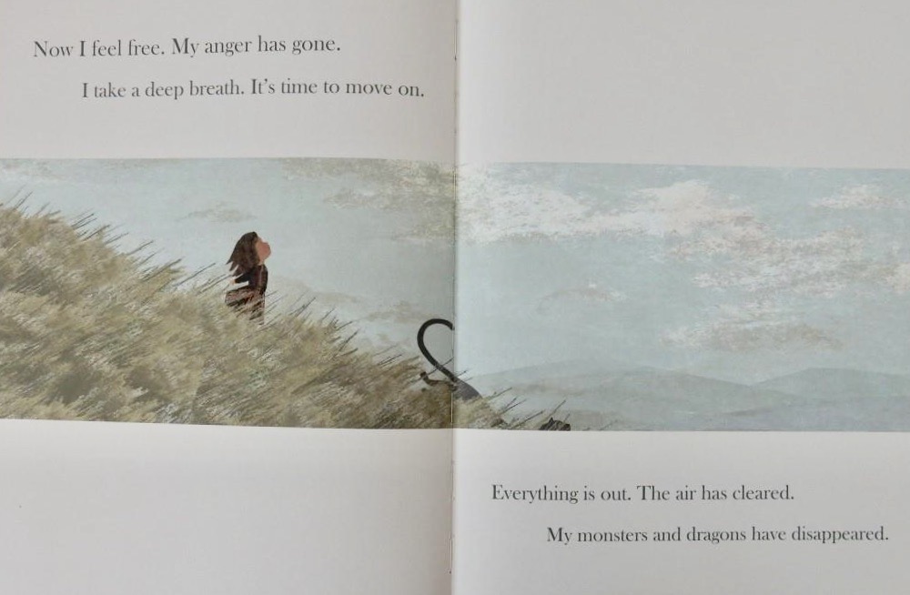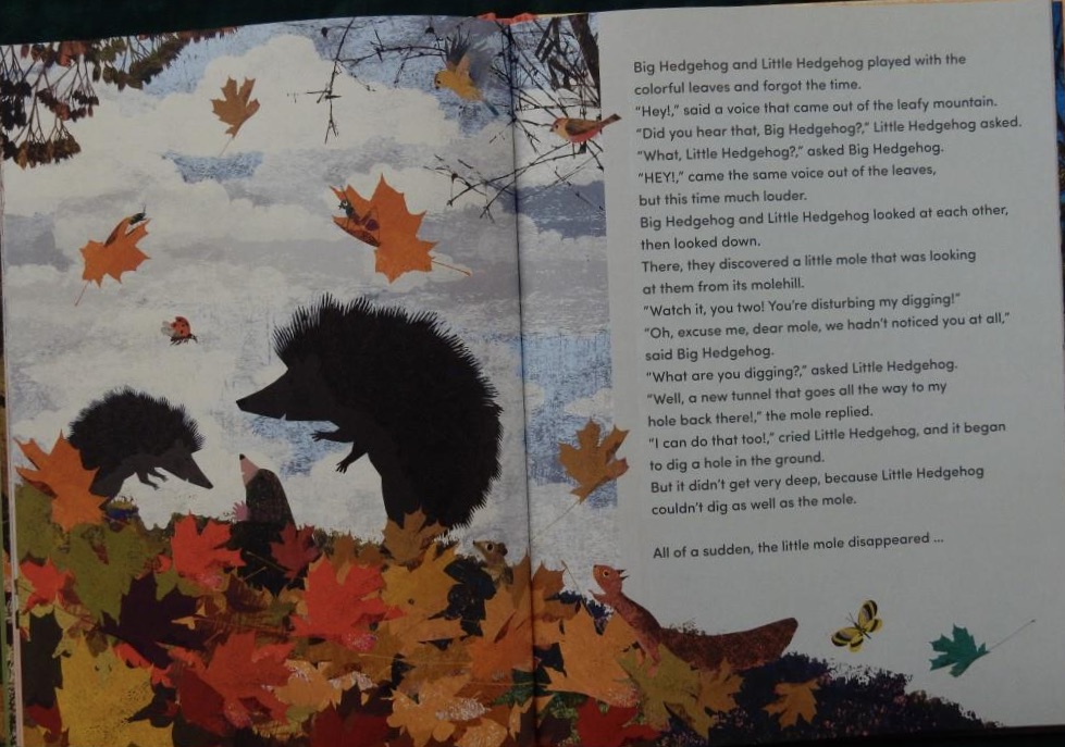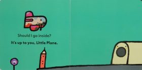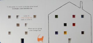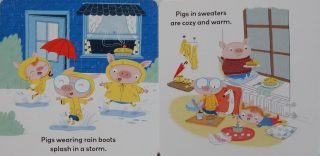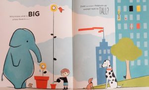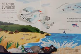 As this brief synopsis shows, Little Penguin’s journey is filled with opposites. The opposing pairs being completed by opening the series of flaps (one per spread) as he moves through the grey murky seascape to his destination atop the distant iceberg.