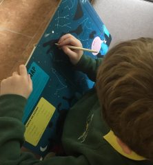 There are 10 ‘scratch and discover’ shapes to investigate with the stylus on every spread as well as a lead-in, easy to understand, factual paragraph (or two), clearly labelled objects and an additional ‘fact’ most in speech bubble form, for example ‘The light from the closest star still takes 4 years to reach us.’