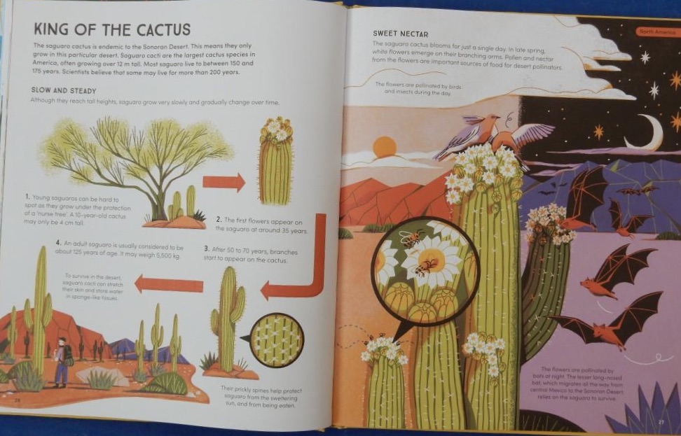 Ten animals have ‘hidden’ themselves in each of Natasha Durley’s alluringly illustrated locations: the Amazon rainforest, the Great Barrier Reef, the Sundarbans Mangrove forest, (between India and Bangladesh), the grasslands of the African Savannah, a coniferous forest of northern Canada, the arid Gobi Desert and Antarctica.