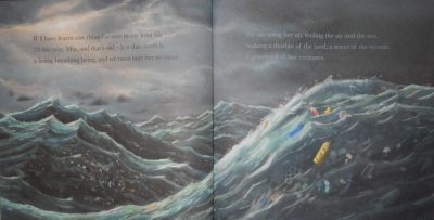 As the two walk together on the beach Grandpa regales the child with his adventures and the wondrous sights he’s seen as an explorer. So vivid are his descriptions that Tessa can see pictures in her mind.