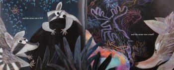 A series of spreads, shows the stone as it is experienced by all manner of wild creatures: a snail crawls over it, a chipmunk stops on it to nibble a nut; for an owl it’s a bright place upon which to perch, while a gull cracking a clam shell finds it ‘loud’,