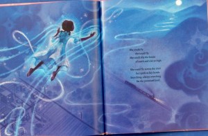 After the lyrical verses and stunningly beautiful skyscapes and landscapes, we read the author’s note wherein she reveals her inspiration came from the final story in the classic folktale collection, The People Could Fly, retold by Virginia Lee Hamilton, illustrated by Leo and Diane Dillon.