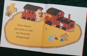 and travelling in the real kind, especially to pay a visit to Granny’s. That’s when she can hear all about the exciting journey, is treated to a picture of the ride, and then she and the puppy have great fun playing in a park sandpit that has a train theme.