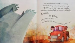 Also tickling my fancy was The Big Red Rose. This features Bubba, a little elephant that sniffs said rose; it goes right up her trunk and becomes stuck. A visit to the vet with Mother Elephant proves unsuccessful despite the fact that, ‘The vet got out his telescope, / a light, some pliers, a bit of rope’. Mother Elephant then resorts to an application from a sneeze-inducing condiment. Will that remove the blockage? Ah / Ah – ah / Ah- ah- ah … “ Hurrah!