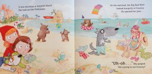 In this tale we meet her as she’s busy with an order for her ‘Just-in-case Cupcakes’ when she receives an emergency call from Little Red Riding Hood reporting the absence of her gran. Before you can say cupcakes are us, Sky has gathered her necessary accoutrements, and is off on her scooter, on a rescue- grandma mission.
