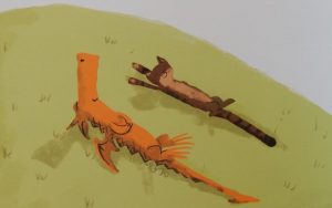The luminous colours of the various prehistoric creatures set against the black background really make the images stand out in Lomp’s striking brush pen and photoshop illustrations. The storyline reminds me somewhat of P.D.Eastman’s’ classic Are You My Mother but the visuals are altogether different.
