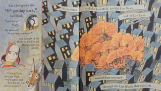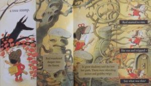 Intrigued by this “human child” the wolf invites Red in for some tea. Red is equally intrigued to learn that the wolf and his pals have acquired the tea drinking habit and over a nice cuppa, they reminisce about the good old days when the forest was extensive and full of delicious things to eat, in stark contrast to the present parlous state.