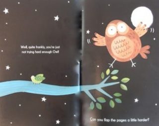 The sun is shining, Owl is fast asleep and doesn’t want to wake up but the book has to start so the reader’s help is needed to rouse our feathered friend.