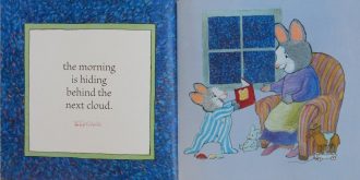 Rosemary Wells’ gently flowing text reads like a lullaby as it talks of the sounds of evening: the simultaneous song of owls and crickets; the night wind that has ‘taken the moon for a ride’, the first soft summer rain.