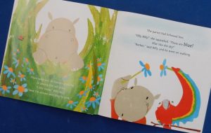 Billy Hippo has learned swimming but he now needs to learn his colours because he wants to give his dad a special birthday present – something pink as his siblings suggest.