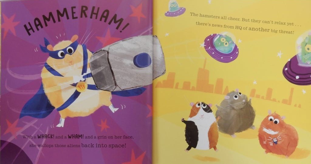 Following on from their terrific Dogs in Disguise and Cats in Chaos, team Bently and Bond present another pet-themed picture book. Here a team of courageous hamsters respond to calls from Hero HQ and proceed to take on alien gerbils invading from outer space. Those are immediately seen off by PomPom aka Hammerham and her trusty massive mallet.