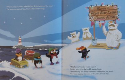 Polar Bear Island is a peaceful place but it only allows polar bears to reside there, a rule strictly enforced by its mayor, Parker. As the story opens said mayor is completing a sign: WELCOME TO POLAR BEAR ISLAND, NO OTHERS ALLOWED. As he does so into view floats penguin Kirby with her large suitcase.