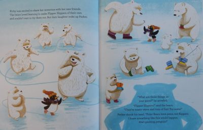 It isn’t long however, before the visitor is impressing the other polar bears with her foot warming, double-sided ‘Flipper Slippers’. These clever inventions serve both as snow waders and ice-skates,