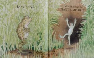 Having reached 10 (piglets) the numbers go up in 5s, so next comes a turkey with 15 poults either peeping or cheeping and the question (repeated each time), ‘Who has more babies than that?’. In this instance the answer is ‘This butterfly’ whose wings cover 20 munching caterpillars, followed by a frog on a lily pad where beneath another there are 25 wriggling squiggling wiggling tadpoles.