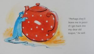 Powerless to make a wish for himself, he sneaks back into the farmhouse and back to his teapot home. So delighted is he at the sight of it that he gives the teapot a stroke, after which something wonderful and surprising happens …