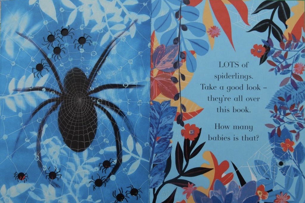 The final two spreads serve to send readers hunting back through all the pages to locate ‘LOTS of spiderlings that Julia informs are ‘all over this book.’ (Surely not literally! I hear you cry!) Plus another quite challenging question to answer.
