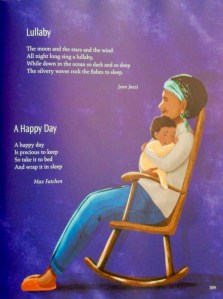 To a teacher and poetry anthologist like myself, many are old favourites, some going right back to my childhood, such as Eleanor Farjeon’s The Night Will Never Stay, Edward Lear’s Calico Pie, Walker de la Mare’s Some One and Frida Wolfe’s Choosing Shoes but I found some new poems too. One such was Jean Jazz’s Lullaby: