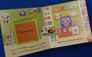 Dusty the dog is a bit of a snooper so tired of being cooped up inside (familiar?) off he goes to explore what the town has to offer. Starting with the café, he visits the bookshop – hurray!,