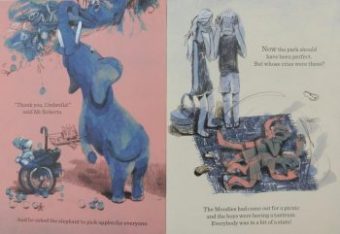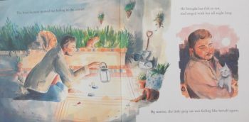 Told in rhyme by Lucy Rowland and pictures by David Litchfield, this story starts with a seed (nothing special at all) and a boy, kind, brave and smart. What should he do about such a seed, the lad wonders. A sprinkle of happiness, a pot together with ‘Some soil and some water. A bit. not a lot.’ That’s what he tells the seed and his Grandma, who is in agreement, so they do the necessary. Then each day they sit happily outside and before long, the seed grows a short stalk: ‘ … the best stalk I’ve seen.” Grandma says. As if encouraged by these words, the stalk continues to grow taller … and taller until it’s taller than the wall over which the boy and Gran see people walking miserably by. It’s clear, “A sprinkle of happiness. / That’s what they need!”