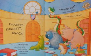 There’s something for everyone in this droll story. The very young will enjoy the frequent interruptions, the fold-out spread surprise and the superbly expressive illustrations of the characters, while older readers and adults will relish the tongue-in-cheek humour and the punning. Everyone I think, will love the throwaway finale tossed in by the tea-trolley pusher when he eventually gains admission.