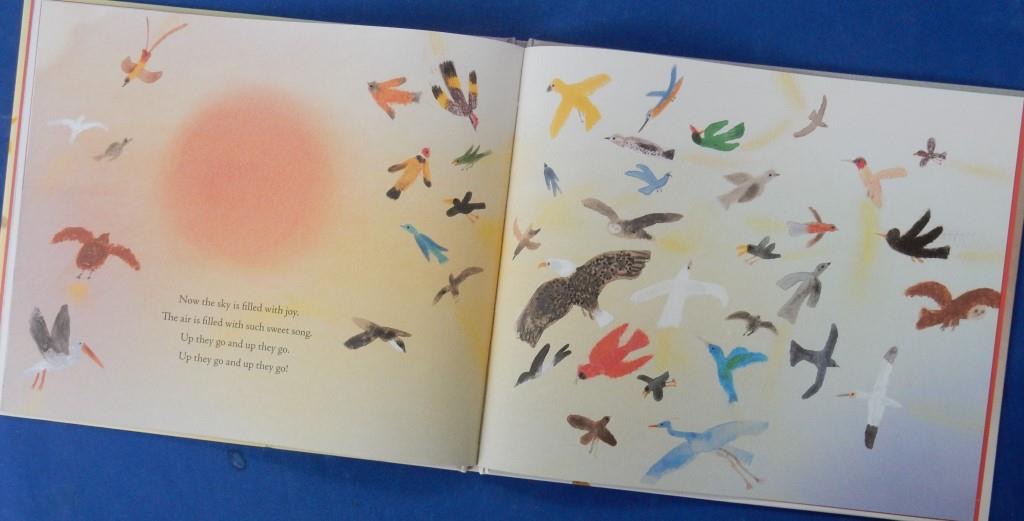 and takes to the air – as a sparrow. Very soon the sky is full with a goldfinch, a rook and a host of other children transformed into birds. With more and more children enjoying their flight, Nancy asks the adults, “But what on earth are you afraid of?” Twice she asks the question and on the second occasion one of the grown ups starts to soar, thoroughly enjoying so doing; and it’s not long before the sky is filled with joyful song and soaring birds.