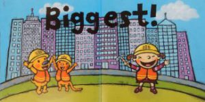 The adorable one-haired baby is back to introduce Daddy. Said male parent is ‘so big and strong’, his ‘legs are so, so long.’ The infant then enjoys a playful time with Daddy – riding piggyback, trying to touch the sky, feeling his unshaven scratchy face, fleeing from a pretend monster, singing, wrestling till they need a rest.