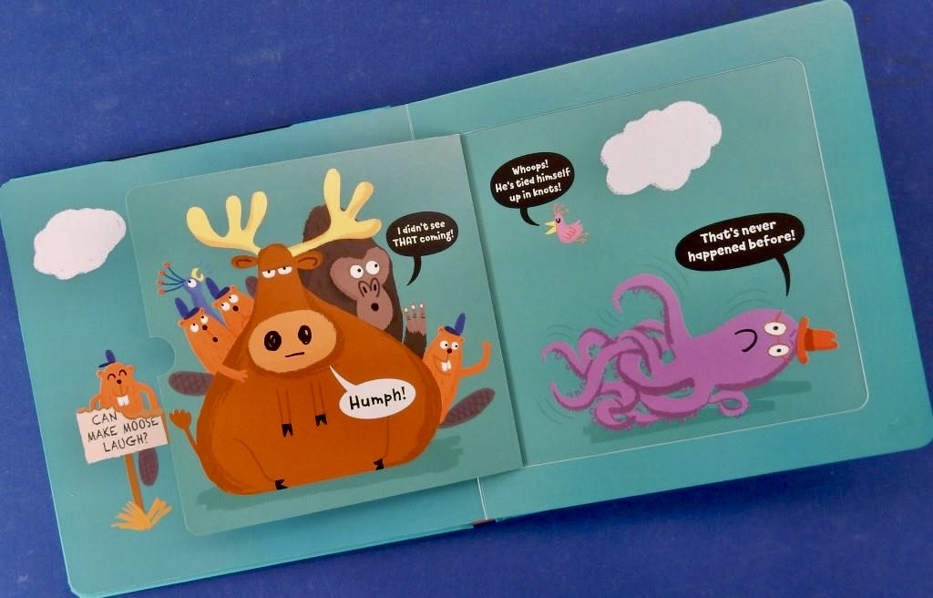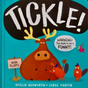 Little ones will need their fingers at the ready to help the creatures in this lift-the-flap board book wherein Moose has set himself up as the cookie to crack in a tickling contest. An assortment of animals – teams and individuals – try their luck at making the antlered animal laugh using their paws, (team Beaver), an array of tail feathers – that’s the proud peacock, then in turn, gorilla, octopus with an abundance of tickling potential