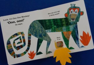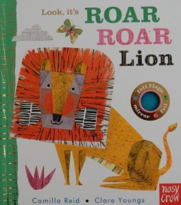 Munch Munch Hippo and the titular Lion. Hidden behind four of the five felt flaps are mini beasts of which the text asks, ‘But can you see the … ?’ while the final spread recaps the creatures’ sounds and then asks ‘But what do YOU say?’ and when the flap is lowered a surprise, shiny mirror is revealed into which tinies will love to make their very own sound.