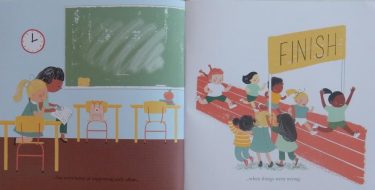He tries our (supposed) suggested counting sheep, a bedtime book – definitely not the best idea – and a chat with last year’s prize caterpillar toy all of which fail and then he recalls his teacher, Miss Chon’s advice to breathe long and deep then mind travel to his ‘happy place …