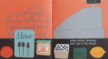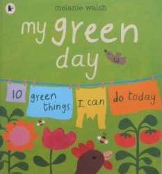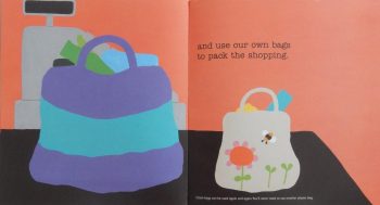Essentially we share the girl’s day and she talks us through the green things that are her way of helping the environment. Each of her ten green actions is printed in large type and then two or sometimes more double spreads are allocated to illustrating and adding to her narration so for instance we have ‘At lunch … ‘I eat up all my pasta.’ and in small print ‘We throw away one third of all the food we buy. If we bought only the food we actually needed to eat, we wouldn’t have to grow or transport so much food, which saves lots of energy.’ This additional information can be left out if the audience is very young but children are never too young to start thinking about the all important messages herein.