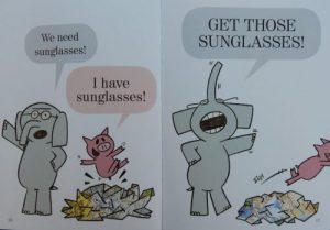 In Elephants Cannot Dance! Piggie announces that she’s teaching all her friends to dance and that includes Gerald. However despite, so he says, that he’d love to learn to dance, Gerald knows that it’s impossible; moreover he has proof. It says so in ‘What Elephants Can Do’ – on page eleven to be precise, which just happens to be the same page number as that particular bit of dialogue. Piggie isn’t having any of that, responding by telling Piggie that the book does NOT say he cannot try so to do. And try is what Gerald does, but his timing and coordination leave a lot to be desired