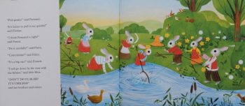 Arthur a little rabbit, and his dad live with their dog Danton on a small farm in a forest clearing. No one goes into the dark menacing forest ,but Arthur’s dad, who doesn’t believe in the tales of such things as ogres residing therein, is keen to find out what lies beyond the forest. so, he thinks hard, comes up with a plan and starts putting it into action. He takes the wheat they have stored, grinds it into grain and bakes dozens of round loaves.