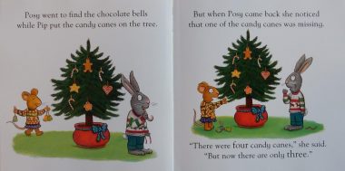 Posy keeps quiet and allows Pip time to confess and then the two work together towards a satisfying solution to their lack of tree ornaments