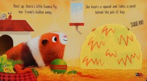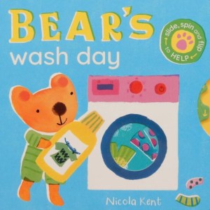 Lion’s neighbour, Bear, is coming to pay him a visit so Lion decides some tidying up is required. There are art materials scattered on the rug that need to go back on the shelf, crockery in the sink waiting to be washed up and put away, a dirty worktop to wipe and floors in need of a run over with the vacuum cleaner. Lion, with the assistance of little humans who use the slippers, flaps and wheel, get the work done just before there comes a knock on the door. Hurrah! Lion can welcome his friend to a spotless home.