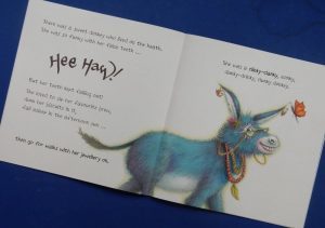 Occasionally however she does get a bit down in the mouth, not on account of her teeth (those can be put back pretty niftily) but when her family fail to visit for a seemingly long time. That makes her grumpy and cranky, until up trot her son Wonky and her granddaughter Dinky. Then back comes that toothy smile and it remains, lighting up her donkey countenance for weeks and weeks – hee haw how splendid is that!