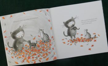 One crisp, blustery autumn morning Ollie, sporting her cat suit and pursued by her beloved moggy Pumpkin, head outdoors. Suddenly Ollie, about to jump into a leaf pile sees that it’s moving and then a sudden gust of wind reveals, hiding among the leaves, a tiny shivery kitten.