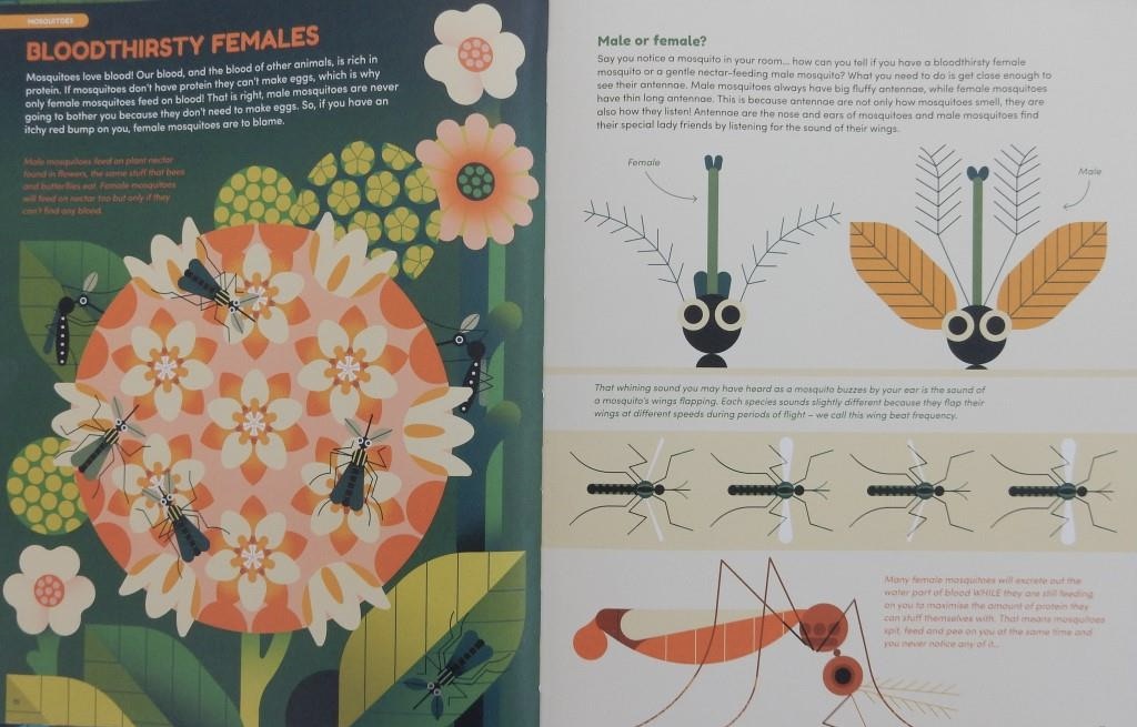 Pakpour starts by defining insects and the scientists who study them after which three or more spreads are devoted to each of the aforementioned pests. She describes their appearance including the difference between males and females, their impact on humans and how they find us, their habitat – I was intrigued to discover that mosquitoes are found everywhere except Antarctica and Iceland where it’s too cold for them to survive, and that it’s only the females that bite.