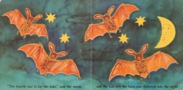Oh no! No round moon now. But when she tells Rabbit and Mole her sad news, they say that nobody can eat the moon. A distraught Little Mouse returns to her hole until dark begins to fall when she hears a noise outside. It’s her friends Mole and Rabbit and they have something to show her, something large and shiny and ROUND in the starry sky. Time for a celebratory sharing of the rest of Little Mouse’s portion of moon, they decide. Mmm – delicious!