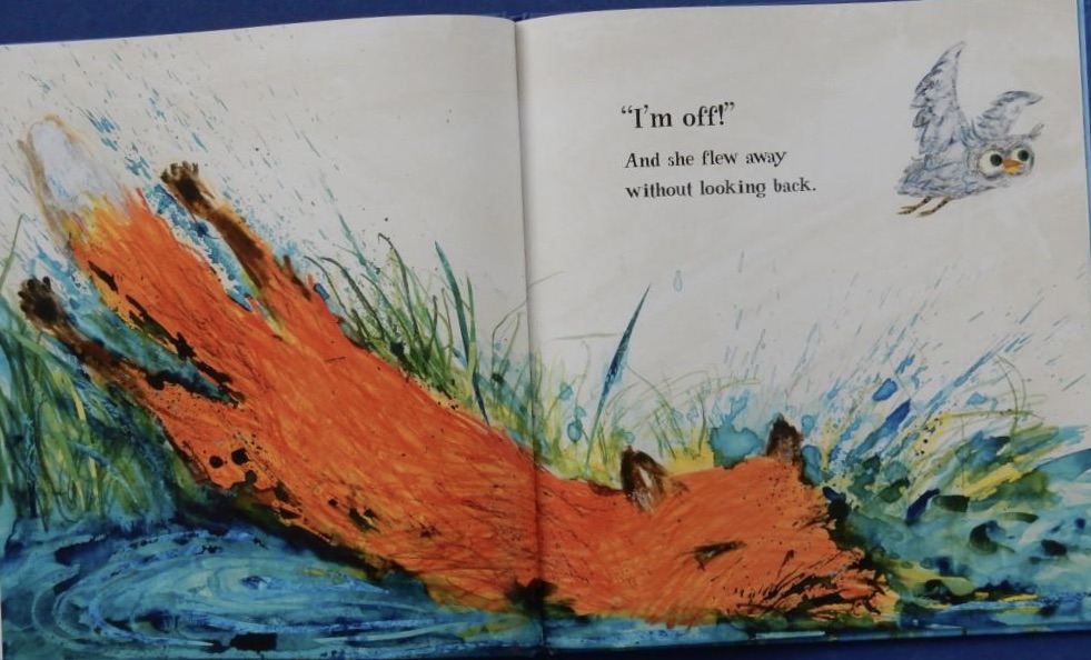 This cleverly designed book, with its peepholes and cutaway pages build up the scenes and extend the action as the story progresses. Horacek’s striking illustrations are created with a variety of media including wax resist and strong watercolours; the various techniques serve to add depth and texture.