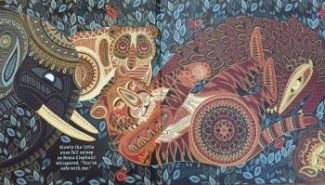Fortunately for them, Mama Elephant – huge and wise – arrives on the scene and with her softly spoken “Hush … You’re safe with me.” rocks the little ones to sleep.