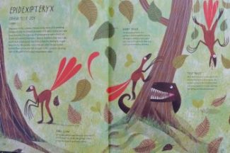 The final spreads look at dinosaur fossils, development from egg to adult, there’s a dino sports event, a look at some other prehistoric creatures and last of all, annotated portraits of extra special dinos in a hall of fame.