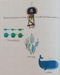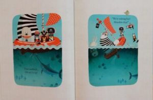 ‘A tiny island, lush and green/(A colour that they’ve never seen). “The trees look soft, we’ll be all right./Hello jungle! Goodbye kite!” – the author’s rhyme is spot on as well as his design. Down they cascade into a jungly landscape full of friendly animals.