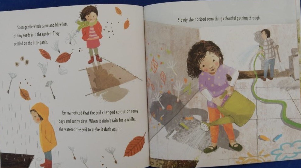 As she stands miserably thinking, that’s my chance of attracting birds gone, she notices something green poking up through a crack in the paving stones, one of which wobbles when she steps on it. She calls her Dad and points it out. Dad’s response is to move the slab. Emma is thrilled to see lots of minibeasts where the slab had been and so begins a process of rewilding an area of the garden.