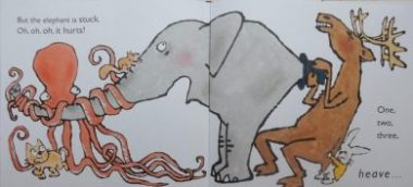 Hungry and Grisselless the pair go off to bed. Tomorrow is another day and tomorrow’s hunt? ‘SOMETHING TO EAT’ Completely crazy, this wildly offbeat story is such fun to read aloud, provided you can keep up the breath-taking pace of Hiawyn Oram’s somewhat Lear-like rhyming saga. Don’t go too fast though; children will want plenty of time to explore Kitamura’s wacky, surreal collage illustrations.