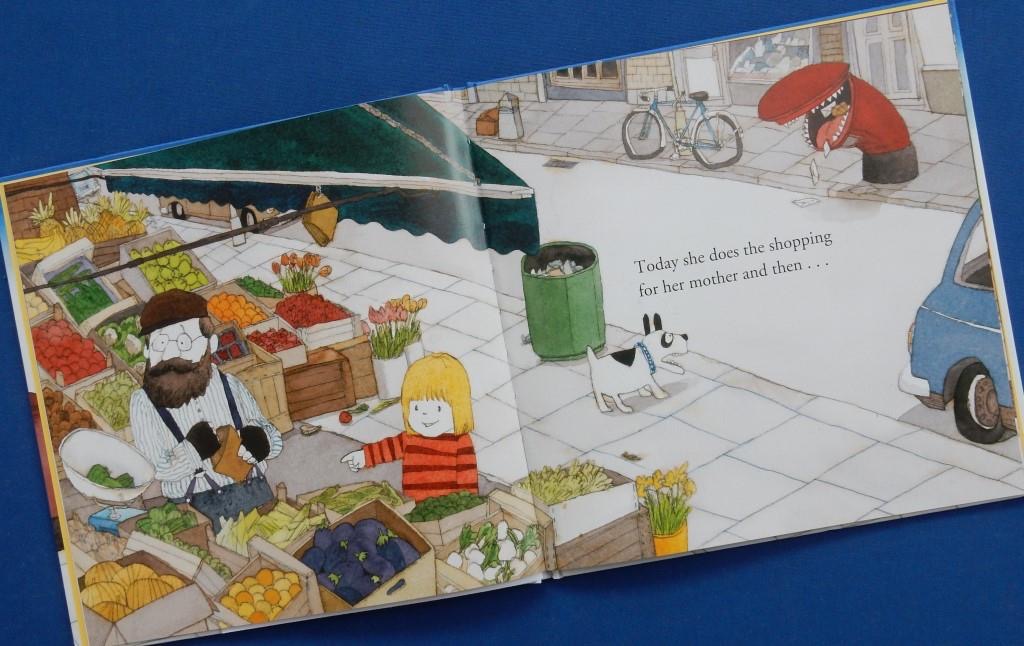 While intent on buying at the market stalls she fails to notice the post box with it’s sharp-toothed mouth but her dog sees.