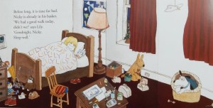 Back home while consuming same with her parents, Lily smilingly tells what she’s seen on her walk, while thought bubbles around Nicky reveal what he might describe were he able to speak.