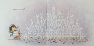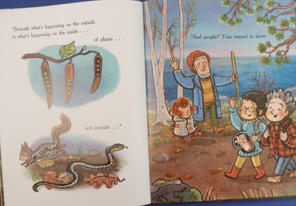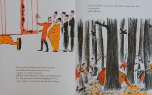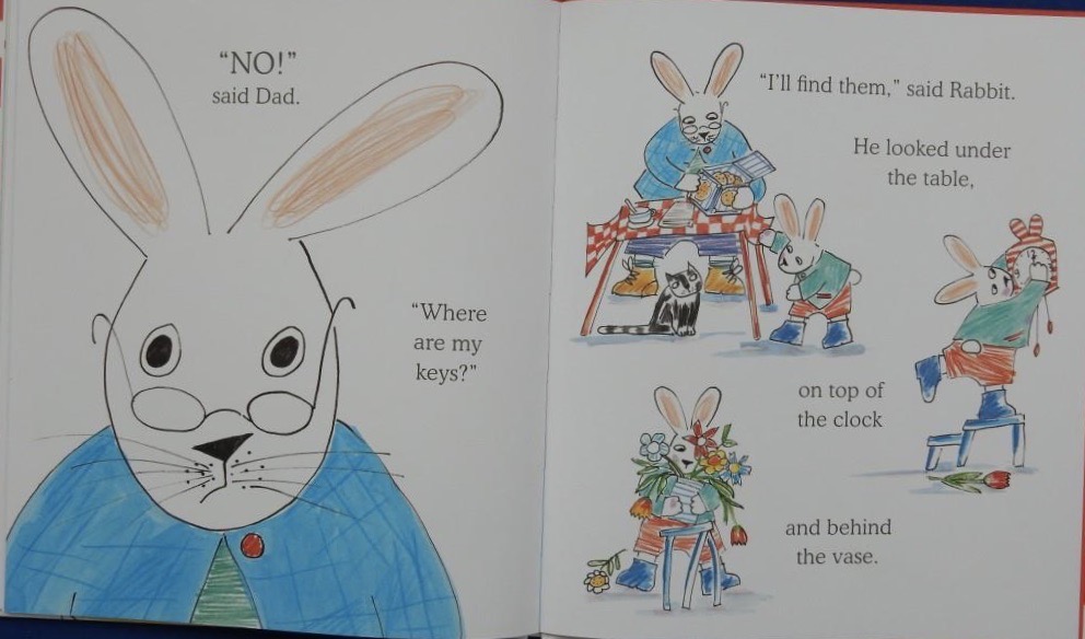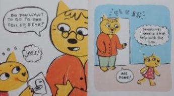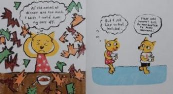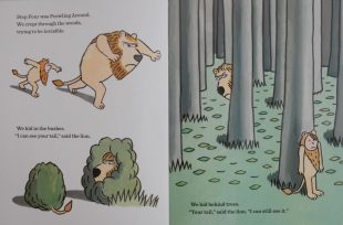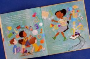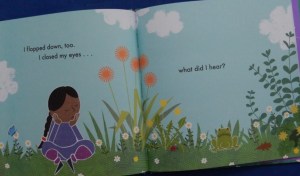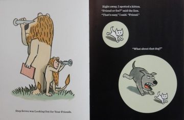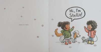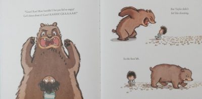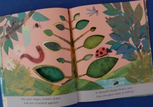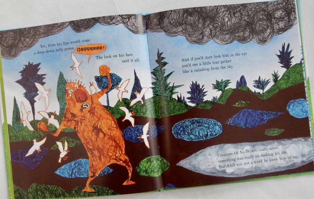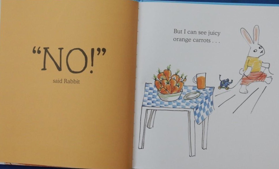 On the first spread readers will find a small orange rectangle containing a smaller black circle and at the bottom of the right page are two little green dots, one labelled ‘power’, the other ‘auto translate’. A turn of the page shows a larger central rectangle within which is a large eye with a black pupil and orange iris. A couple of page turns on a portal opens up to reveal two extraterrestrial beings – Blrg, (with yellow skin) and Zrk (with orange skin). At first these two creatures are petrified concluding “Aliens are real!!!”
